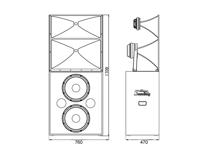 > It consists of one φ75 mm voice coil HF horn, oneφ100 mm voice coil MF horn and φ75 mm voice coil woofers.