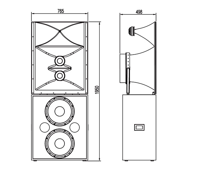 > 1" throat compression driver equipped with a φ44mm voice coil, two 6.5" midrange speakers with φ38mm voice coil and two 15" woofers with φ75mm voice coil.