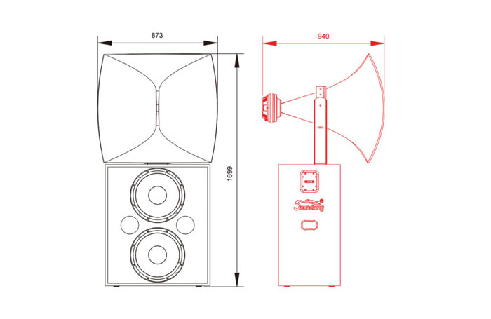 > HF section is a constant directivity horn loaded to a 2" throat compression driver equipped with Φ100mm voice coil. The low frequency is two 15" woofers with Φ100mm voice coil.