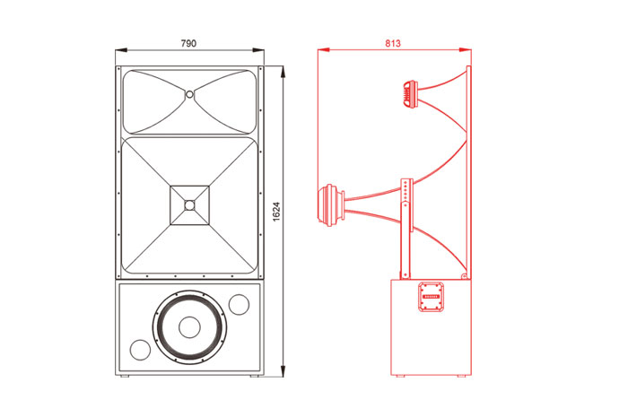 > It consists of one φ75 mm voice coil HF horn, oneφ100 mm voice coil MF horn and φ100 mm voice coil woofers.