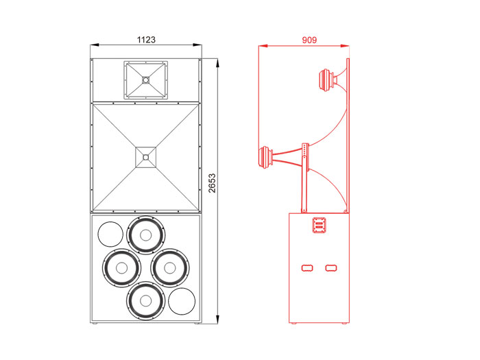 > It consists of one φ100 mm voice coil HF horn, oneφ100 mm voice coil MF horn and four φ100 mm voice coil woofers.