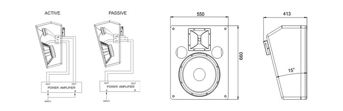 Model FCE415H Type 15" Surround Speaker System Freq Response 50Hz-18K Hz(±3dB) Impedance 8Ω Power 350W Sensitivity(1W@1m) 98dB Max.SPL 129dB Coverage (H×V) 100°X60° Crossover 1.5K Hz Speaker unit 15" x1+1.75" x1 Dimension(W×H×D) 550x660x413mm Weight 29kg