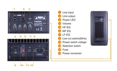 Model FHE8A FHE10A FHE12A FHE15A Type 2- way 8” active loudspeaker 2- way 10” active loudspeaker 2- way 12” active loudspeaker 2- way 15” active loudspeaker Frequency response 65Hz~20kHz(-10dB) 55Hz~20kHz(-10dB) 45Hz~20kHz(-10dB) 40Hz~20kHz(-10dB) Max SPL 120dB 124dB 126dB 128dB Coverage(H*V) 90°x60°(rotatable) 90°x60°(rotatable) 90°x60°(rotatable) 90°x60°(rotatable) Crossover 3.0kHz 2.5kHz 1.8kHz 1.5kHz LF 8”MF/LF / 50mm Voice Coil 10”MF/LF / 75mm Voice Coil 12”MF/LF / 75mm Voice Coil 15”MF/LF / 75mm Voice Coil HF PK diaphragm / 44mm Voice Coil PK diaphragm / 44mm Voice Coil PK diaphragm / 44mm Voice Coil Ti / PEN diaphragm / 75mm Voice Coil Input connector JACK / XLR JACK / XLR JACK / XLR JACK / XLR Input sensitivity 0dBu 0dBu 0dBu 0dBu Amp power rated 200W(LF)+60W(HF) 300W(LF)+60W(HF) 350W(LF)+100W(HF) 400W(LF)+100W(HF) Dimension(WxHxD) 300x514x330(mm) 340x578x357(mm) 390x660x409(mm) 424x740x437(mm) Weight 18kg 21kg 26kg 36kg