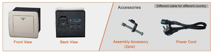 Connector Features Power AC 100-240V 50/60HZ 10A Audio 3.5mm stereo jack Computer 15P VGA female Internet RJ45 EIA/TIA 568B Standard