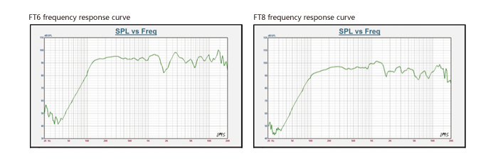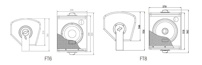 Model FT6 FT8 Type 2-way 6”Full range 2-way 8”Full range Frequency response 120Hz-18kHz (-10dB) 100Hz-18kHz (-10dB) Sensitivity(1W@1m) 90dB 92dB Nominal Impedance 8Ω 8Ω Power handling 100W (continuous), 400W (peak) 150W (continuous), 600W (peak) Crossover 3.5kHz 3kHz Coverage (HxV) 60°X 60° 60°X 60° Max.SPL 116dB 120dB Connection socket 2XNL4MP 2XNL4MP Dimension (WxHxD) 238x288x216.3(mm) 270×245×310(mm) Weight 8.5kg 11.75kg