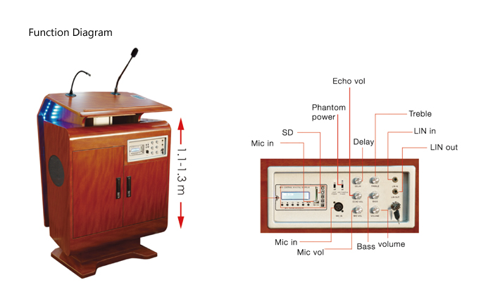 Accurate low noise motorized mechanism adjust the height to suit for different lectors.The system is designed with quality power amplifier of two mic inputs,SD card port/USB interface to play MP3,bluetooth function for playing.PT05A has foldable boards on two sides to expand the desk.