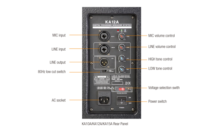 Model KA10A KA12A KA15A Type 10 " 2way active speaker 12 " 2way active speaker 15 " 2way active speaker Frequency response 60Hz-20kHz(-10dB) 50Hz-20kHz(-10dB) 45Hz-20kHz(-10dB) Sensitivity(1W@1m) -10dBV±1dBV -10dBv±1dBv -10dBv±1dBv Amp power rated 200W 250W 250W Crossover 2.0kHz 2.2kHz 2.0kHz LF 10" woofer 50 mm voice coil 12" woofer 65 mm voice coil 15" woofer 65 mm voice coil HF 34mm driver/1inch exit 34mm driver/1inch exit 34mm driver/1inch exit Coverage(HxV) 80°x60° 80°x60° 80°x60° Max SPL 121dB 123dB 123dB Dimension(WxHxD) 353.5x555x426(mm) 409x628x472 (mm) 452.6x710x518(mm) Weight 20.8kg 25.5kg 31.3kg