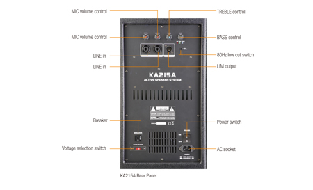 Model KA215A Type 2x15 " active woofer Frequency response 40Hz-20kHz(-10dB) Sensitivity(1W@1m) -10dBv±1dBv Amp power rated 500W Crossover 2.2kHz LF 2x15" woofer 65 mm voice coil HF 44mm compression driver /1 inch exit Coverage(HxV) 80°x60° Max SPL 129dB Dimension(WxHxD) 471.7X1050X538(mm) Weight 54.7kg Bottom wheels for easy moving