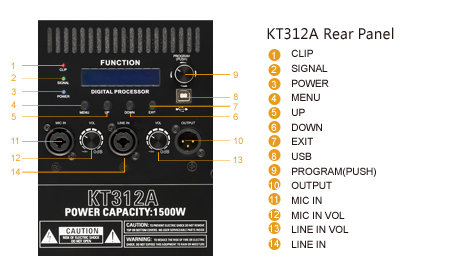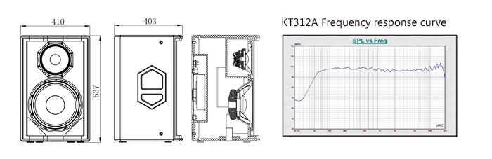 Model KT312A Type Active Coaxial Loudspeaker Frequency response 58Hz~18kHz(±3dB) Input Sensitivity 0dBu Max SPL(@1m) 136dB(peak) Amp. power 1500W Coverage(HxV) 60°x60° Crossover (LM/MH) 300Hz(Active)