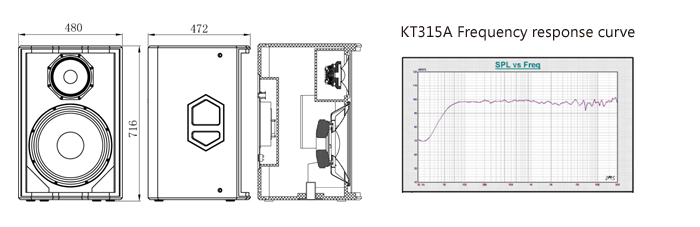Model KT315A Type Active Coaxial Loudspeake Frequency response 50Hz~20kHz (±3dB) Input Sensitivity 0dBu Max SPL(@1m) 137dB (peak) Amp. power 1500W Coverage(HxV) 60°x60° Crossover (LM/MH) 300Hz(Active)