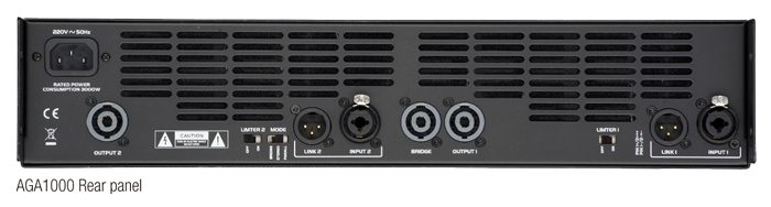 MODEL AGA1000 AGA1600 AGA2200 AGA3500 Output Power 8Ω 2x310W 2x550W 2x780W 2x1200W Output Power 4Ω 2x500W 2x810W 2x1150W 2x1900W Output Power 2Ω 2x700W 2x1000W / / Bridge Output power 8Ω 1000W 1600W 2200W 3600W Bridge Output power 4Ω 1300W 1900W / / Input Sensitivity 0dBu(0.775V) Frequency Response (20Hz-20KHz)+0dB/-0.5dB S/N Ratio(A-weighted) 100dB THD at rated output power <0.1%(MBW=80kHz,1kHz) Crosstalk (A-weighted) <-75dB Damp Factor(1kHz 8Ω) >300 >400 >400 >400 Protection Audio Limiters,High Temperature,DC,Short Circuit,HF,Peak Current Limiters,Turn-on Delay Power Requirements 220~240AC 50/60Hz 110~120@220~240AC 50/60Hz Weight 19kg 22kg 23kg 37kg Dimension(W×D×H)mm 483x410x88 483x420x88 483x420x88 483x420x133.3