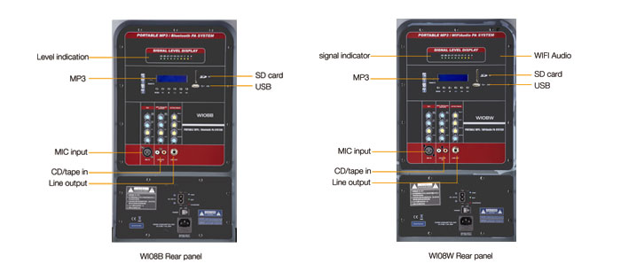 Soundking WI08 series PA system is equipped with 8”speaker, plastic enclosure, two built-in 4.5Ah batteries(charging 4-6 hours, operating for more than 4 hours), MP3with USB/SD card port, LCD, mic input, reverb effect, classD power amplifier and mixer. The product features multi-function, high quality performance, high cost performanceratio. WI08B has bluetooth, and WI08W has WIFI Audio to receiveplayer signal, e.g. cell phone.