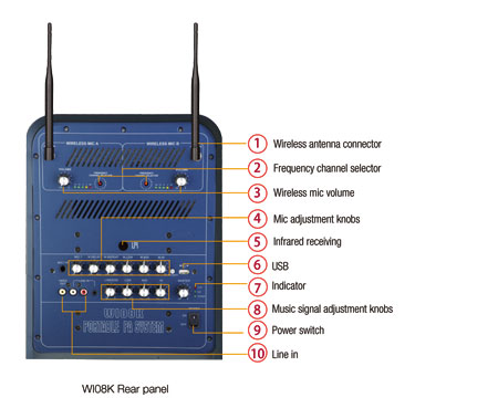 Model WI08K Power 80W/8Ω Frequency response 20Hz—20kHz(-10dB) THD <0.5% Karaoke system 1T hard disk + WIFI ( 2T or 3T hard disk) Input sensitivity LINE: -10dBu MIC: -40dBu Max SPL 113dB Power supply AC 200V~240V DC 12V Battery 12V4.5Ahx2 Accessories Remote control 1pcs ; Wireless mic antenna 2pcs Wireless microphone Handheld microphone 2pcs 1.5V battery 2pcs DC power cord 1pcs Stand DB01-2 1pcs (Optional ) Handheld mic 2pcs 1pcs (Optional )