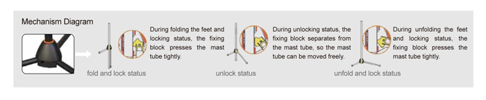 ● fold/unfold the labeled foot to move the mast tube, easy operation.