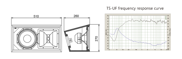 TS-UF consists of a B&C 8”cone woofer and a 1.73” Nd magnet HF compression driver. The HF coverage is 100°(H)X70°(V). The external digital processor optimizes the loudspeaker performance. Glass fiber constant directivity HF horn delivers delicate tone and splendid pan. 12mm plywood cabinet with slot-tongue structure offer robust tone. The cabinet is designed with 15 M6 flying points for quick and reliable suspension.