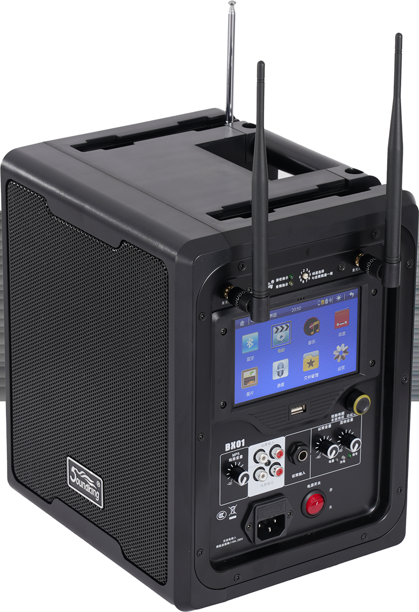 BX01 is a multifunctional active loudspeaker, crafted from reinforced and lightweight ABS engineering plastic through injection molding. Its unique design is not only aesthetically pleasing but also convenient to carry. Equipped with a 5-inch screen MP5 player, a built-in U-band wireless microphone (with a reception range exceeding 50 meters), it supports audio and video playback, playback via bluetooth connection, programmed timed playback, and radio listening functions. It features a built-in TF card slot and is compatible with external U-disks, allowing users to freely copy or manage files. The loudspeaker utilizes a high-low-frequency passive crossover circuit and an efficient Class D amplifier to ensure clear, powerful, and distortion-free sound output. Additionally, it is equipped with a large-capacity rechargeable lithium battery and a smart charging system, providing long-lasting battery life without worries. It is suitable for applications such as meetings, teaching, outdoor activities, leisure entertainment, and commercial promotion.