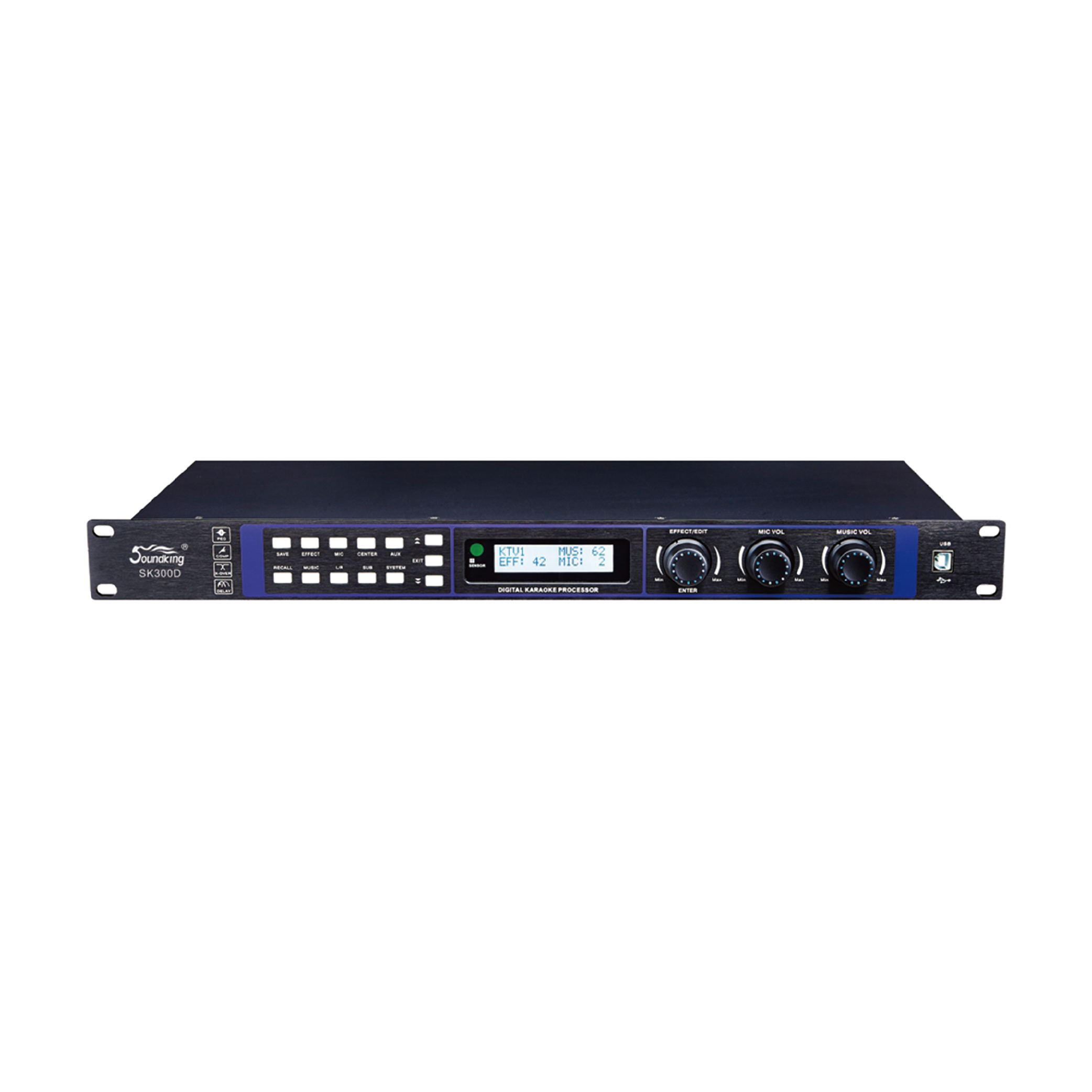 The SK300D Karaoke Effects Processor is a professional audio tool designed to deliver superior sound quality for karaoke and live performances. Featuring over 15 stereo reverbs (including hall, cathedral, and room modes), and traditional effects like delay, modulation, and compression, this processor offers comprehensive audio control. With advanced feedback suppression, parametric equalizers across all channels, and the ability to store up to 16 user-defined presets, the SK300D is an ideal solution for sound engineers and performers looking for precise sound customization and seamless audio optimization.
