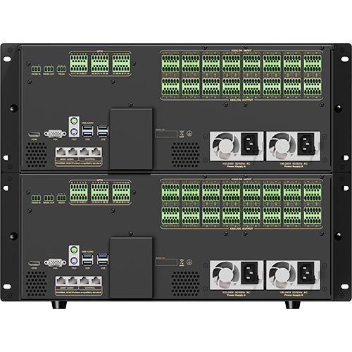 | Rear panel | AC power interface: 2; RJ45 2.5G network audio interface: 2; RJ45 network control interface: 2; USB Audio interface: 1;USB debugging port: 3; HDMI interface: 1; VGA interface: 1; PS/2 mouse and keyboard interface: 1; RS232 interface: 1; RS485IN: 1;RS485 OUT: 1; GPIO: 16 groups (32, customizable input/output); Analog input interface: 32 (customizable); Analog output interface: 32 (customizable) PS: All corresponding interfaces on the back panel can be used individually; the quantity is doubled. |